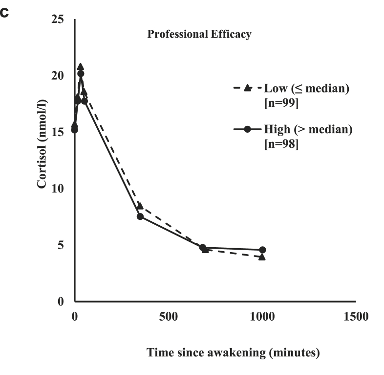 Profile of the diurnal cortisol response by low and high categories of professional efficacy.