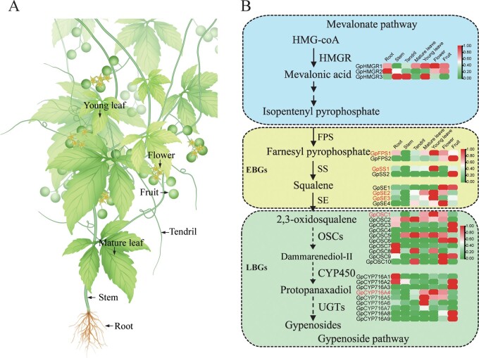 Comparative transcriptome analysis of genes involved in the gypenoside biosynthetic pathway. (A) Different plant parts of G. pentaphyllum. (B) A simplified representation of the gypenoside biosynthetic pathway. Gypenoside enzyme-encoding genes are divided into two groups—early and late. Early biosynthesis genes (EBGs) encode enzymes leading to 2,3-oxidosqualene production, whereas late biosynthesis genes (LBGs) encode enzymes leading to gypenoside production. The expression value of each gene is coloured in log10 (FPKM) in seven tissues: root, stem, tendril, young leaf, mature leaf, flower, and fruit. Low to high expression is indicated by a change in colour from green to red. Genes showing young leaf-specific expression are indicated in red. Dashed arrows indicate that the gene function needs to be verified.