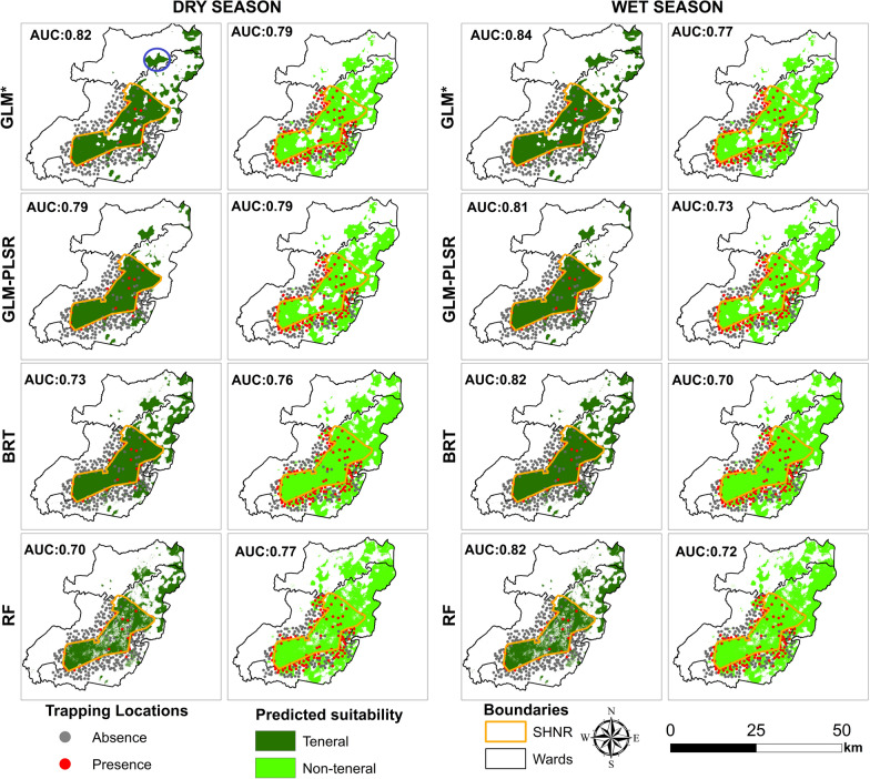 In Kenya, tsetse collections were carried out in 261 randomized points within Shimba Hills National Reserve (SHNR) and villages up to 5 km from the reserve boundary between 2017 and 2019. Considering their limited dispersal rate, we used in situ observations of newly emerged flies that had not had a blood meal (teneral) as a proxy for active breeding locations. We fitted commonly used species distribution models linking teneral and non-teneral tsetse presence with satellite-derived vegetation cover type fractions, greenness, temperature, and soil texture and moisture indices separately for the wet and dry season. Model performance was assessed with area under curve (AUC) statistics, while the maximum sum of sensitivity and specificity was used to classify suitable breeding or foraging sites.