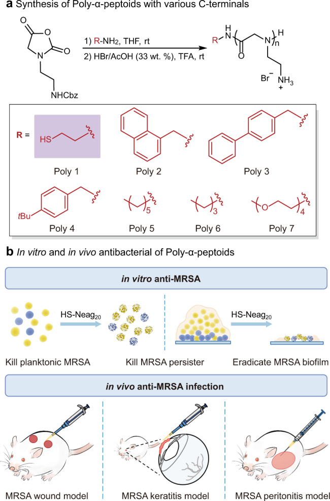 In this study, we design and synthesize a series of peptoid polymers, poly-N-aminoethylglycine (poly-Naeg), via the convenient one-pot ring-opening polymerization (ROP) of α-amino acid N-substituted N-carboxyanhydrides (α-NNCAs) (Fig. 1a). The optimal peptoid polymer displays superior antibacterial properties: with effective activities against MRSA, persister cell killing, effective eradication of MRSA biofilms, and in vivo anti-infectious effectiveness in a mouse wound model, a mouse keratitis model, and a mouse peritonitis model induced by MRSA (Fig. 1b). It is noteworthy that bacteria are unable to acquire resistance against the peptoid polymer owing to the antibacterial mechanism, including the generation of reactive oxygen species (ROS).