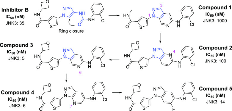 In the crystal structures of inhibitors A and B with JNK3 (PDB IDs: 4WHZ and 7KSK),18,22 the pyrazole nitrogen is binding to the hinge of the ATP pocket. Remarkably, we noticed that the urea moiety and the pyrazole moiety are almost coplanar.18,22 We reasoned that derivatives based on a ring-closure from the urea carbonyl group to the pyrazole 5-position (Figure 2) might still give a high JNK3 affinity. In addition, the newly formed indazole/aza-indazole ring is expected to have a higher intrinsic brain penetration than the pyrazole-urea combination in inhibitors A and B, mainly due to the more rigid structures and lower PSA values.