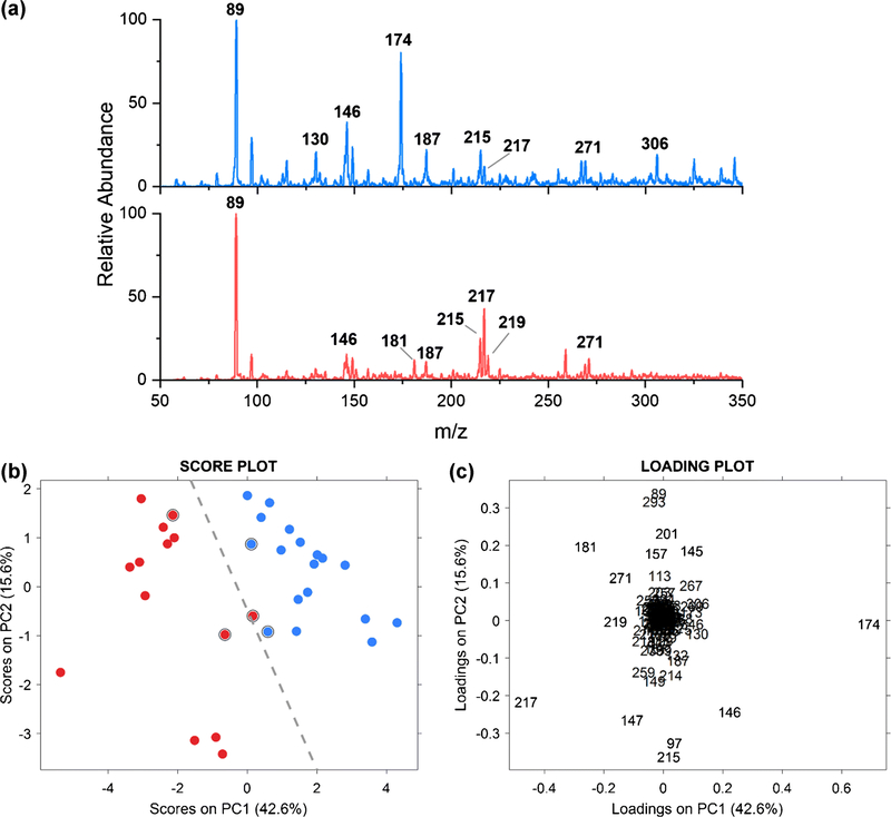 Full scan profiling of brain extracts in the positive ion mode. (a) Representative mass spectra of healthy brain (blue) and glioma extracts (red) recorded by nESI. (b) PCA score plot of the 18 healthy and 14 glioma brain extracts using abundant positive-mode spectral features. The separating hyperplane (grey dotted line) was optimized by the soft-margin support vector machine using the circled data as support vectors. (c) PCA loading plot showing spectral features which contribute most to the separation.