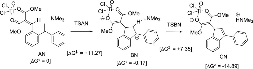 The steps AN → BN → CN were calculated (Scheme 13). The energy of transition state of cyclization, TSAN (ΔG‡ = +11.27 kcal/mol), is higher than that of deprotonation by Me3N, TSBN (ΔG‡ = +7.35 kcal/mol).