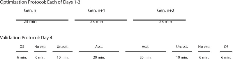 Experimental protocol. Exoskeleton assistance was optimized for three days and validated on a fourth day for each speed. Each optimization day consisted of three, 26-min-long generations with optional breaks in between each generation. On the validation day, we measured participant’s baseline metabolic rate as they stood quietly for 6 mins (QS). Participants then walked with no exoskeleton for 6 min (No exo.), in the exoskeleton with no assistance applied for 10 min (Unasst.) and then with optimized assistance for 20 min (Asst.). The protocol was then completed in the reverse order to remove effects from ordering. Participants rested at least 3 min before each of the walking conditions and at least 5 min before quiet standing conditions