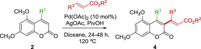 The selective functionalization of the coumarin skeleton is also an important issue as, in addition to the biological properties, the extension of the conjugation could affect, for instance, their photophysical properties.62,63 Thus, several procedures have been developed for the C3 alkenylation of coumarins. For instance, palladium-catalyzed decarboxylative couplings have been described for the functionalization of coumarins with cinnamic acids64 and for the reaction of coumarin-3-carboxylic acid with acrylates.65 In addition, the selective C3 alkenylation of non-substituted coumarins has also been efficiently accomplished through the oxidative Heck reaction.66 Thus, we decided to study the derivatization of selected 4-substituted coumarins through a second intermolecular C–H alkenylation reaction.