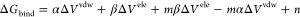 where ΔVb-fvdW denotes the change in van der Waals interactions between the bound and the free states. The ΔVb-f and ΔVb-feleintra terms indicate the change in electrostatic interactions when the ligand is transferred from the solution (free state) into the solvated receptor binding site (bound state). It is worth noting that the electrostatic energy calculated from a force field and the solvation energy are coupled, so the solvation effect is explicitly considered when discussing the source of the energy contributions.