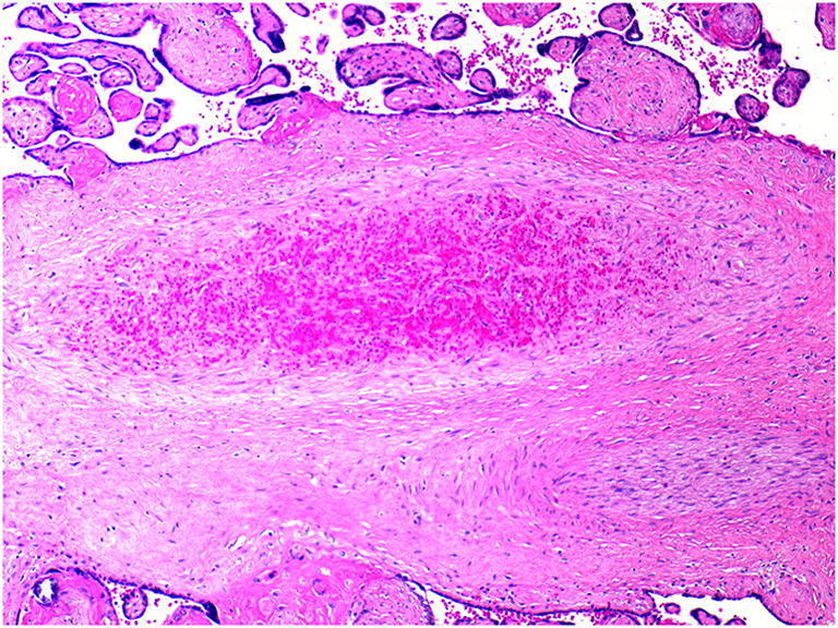 Fetal vascular malperfusion (FVM) (old term fetal thrombotic vasculopathy) is a chronic vaso-occlusive disorder involving the placental villous tree that arises secondary to upstream fetal vascular thrombo-occlusive events [21, 22]. Cessation of blood flow results in involution of affected groups of terminal villi, which eventually become avascular. FMV most commonly reflects vascular stasis from umbilical cord vascular obstruction [23]. Vascular stasis may result from umbilical cord prolapse, hypercoiling (Fig. 1), true cord knots (Fig. 1), excessive cord length, or velamentous insertion, and so these features may be evident macroscopically [23, 24]. There is thus far no conclusive evidence that thrombophilia alone increases the prevalence of FMV [25, 26]. FMV also predisposes affected fetuses/neonates to somatic thromboembolic events [27, 28] and may be a cause of unexpected neonatal encephalopathy and neurologic impairment in term neonates that can predispose to unexpected neonatal death [29]. An autopsy study of third trimester stillbirths also found a correlation of with neuronal injury [30]. A six-fold increase in fetal cardiac abnormalities has been reported in the presence of FVM [31]. Gross manifestations of FMV include thrombi within the umbilical cord vasculature or surface chorionic vessels (Fig. 2a, b) and if long standing, an area (s) of placental disc pallor (Fig. 3a). Such gross findings require histological confirmation. Histological manifestations include intramural fibrin deposition (old term intimal fibrin cushion, Fig. 4) or chorionic or stem vessel obliteration (old term fibromuscular sclerosis, Fig. 3b) affecting large fetal vessels, villous stromal-vascular karyorrhexis (old term hemorrhagic endovasculitis) (Fig. 5) and avascular chorionic villi (Fig. 3c) [22, 32]. High grade FMV is regarded as being more clinically significant and can be associated with sudden deterioration in the first 24 h and perinatal death [17, 22, 32–34]. The early changes of the FMV are those of villous stromal-vascular karyorrhexis and occur within six hours, followed by involution of the stem vessel which is seen by 48 h, and finally avascular villi which takes around two weeks. These changes are identical to those seen in association with intrauterine demise but usually only affect a segment of the placenta [35]. FVM can occur at any gestation but is most commonly seen in association with third trimester stillbirths.