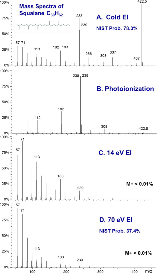 A comparison of mass spectra of the highly branched C30H62 squalane hydrocarbon, as obtained by cold EI (A, upper MS), photoionization (B, second MS), 14 eV EI (C, third MS), and 70 eV standard EI (D, bottom MS). The NIST library identification probabilities of cold EI and 70 eV standard EI mass spectra are also included.
