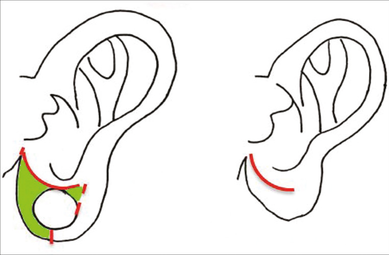Drawing of ear. Green outlines the tissue excised and the solid red line shows incision placement on the left and scar orientation on the right