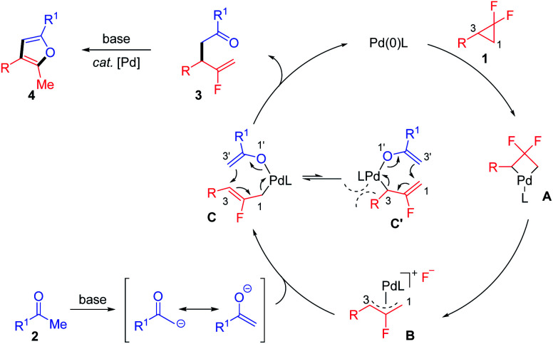 Taking the above results and literature reports together, a plausible reaction mechanism was proposed to illustrate the regioselectivity and chemodivergent reactivity of this transformation (Scheme 3). Initially, the Pd(0) catalyst reacts with gem-difluorocyclopropane via C–C bond activation and C–F bond cleavage to generate the allyl-Pd(ii) complex B. The two fluorine atoms on the cyclopropane ring make the C1–C2–C3 bond angle increase and distal (C1–C3) bond lengthen, thus leading to the distal bond in the gem-difluorocyclopropane more easily cleaving during the ring-opening process.26 This highly selective ring-opening mode was also calculated by Fu and coworkers with the lower energy barrier of the oxidative addition of the C1–C3 bond (7.9 kcal mol−1) versus oxidation of the C2–F bond (46.5 kcal mol−1).7 Also, considering alkyl substrates such as 1m are also active in the mono-defluorinative alkylation, we suspected that it was less possible for the current ring-opening of gem-difluorocyclopropane in the SN2 fashion, where the interactions existed between the aryl unit of the aziridines and Pd catalyst.13b Then, the transmetalation of B with enolate as the π-ambident nucleophile derived from deprotonated ketone 2, affords the crucial bis(η1-allyl) intermediate C, which undergoes inner-sphere 3,3′-reductive elimination,25 guaranteed by the sterically encumbered NHC ligand to deliver the branched product 3 and regenerate the Pd(0) catalyst. The furan product 4 was formed via the base-mediated enolization/nucleophilic substitution/rearomatization sequence promoted by the less-congested Pd-3 catalyst. Therefore, the elaborate design of ligand structure and modification of reaction conditions (e.g. base, reaction time) could enable the exquisitely chemodivergent synthesis of β-monofluorinated alkenes and/or corresponding furan products via selective C–F bond cleavage.