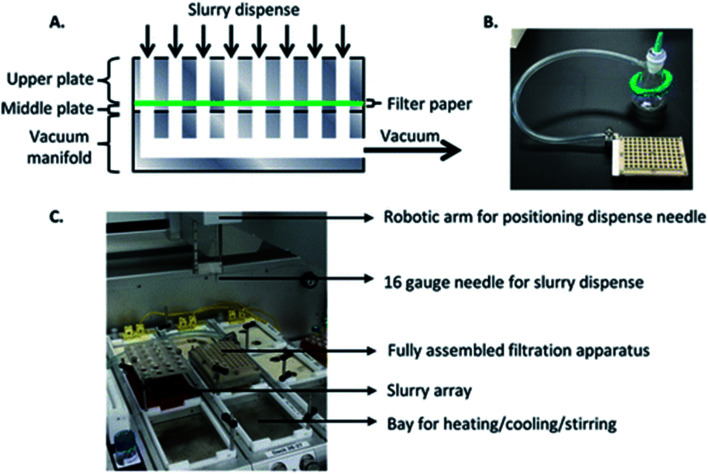 Filtration modules for separating solid and liquid phases can be utilized in workflows involving salt, crystal polymorph, co-crystal, and solubility screening. These workflows are typically designed to be high-throughput in order to maximize the diversity of parameters under evaluation. In addition, researchers are generally interested in both solid and liquid component analysis. Slurries are filtered through plate assemblies containing a cellulose- or membrane-based top filter plate outfitted with a bottom collection plate. Separation is promoted through the application of vacuum or centrifugal force to the filter plate assembly. Janey and coworkers describe a custom plate assembly with a XRPD-compatible (X-ray powder diffraction) filter plate for solid polymorph screening and analysis (Fig. 5).18 Qiu and Albrecht report the implementation of a commercial filter plate assembly with a similar configuration developed by Unchained Labs for solubility screening.19 The advantage of the Unchained Labs filter plate is the ability to carry out solid–liquid separations at various temperatures.