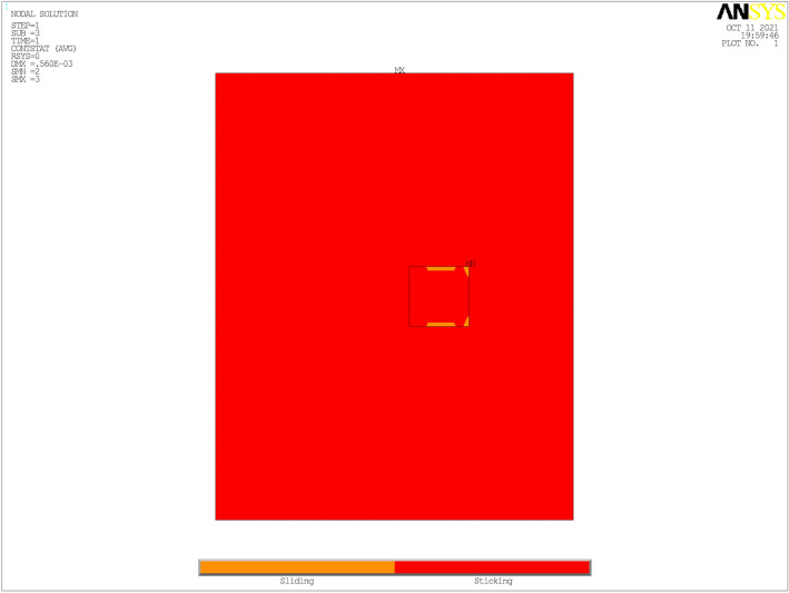 In Eq. (8), is ultimate stress along tangent direction between adjacent layers. is the coefficient of sliding friction between adjacent layers. is stress of compression or tension in normal direction. is bonding stress at adjacent layers. In Eq. (9), is equivalent stress along tangent direction between adjacent layers. Now let's analyze the deep meaning of the Eqs. (8) and (9). In Eq. (8), assuming that the stress is zero and the bonding stress at adjacent layers is not zero, then the adjacent layers bond together because of the bonding stress. On the contrary, the phenomenon of bonding failure will appear between adjacent layers as the bonding stress is none. In Eq. (9), if the equivalent stress at adjacent layers is less than or equal ultimate stress , the corresponding nodes at the adjacent layers keep sticking state, otherwise the corresponding nodes at the adjacent layers come into slide. In this study, the bonding stress between the adjacent interfaces is 0.5 MP12, and is 0.5.