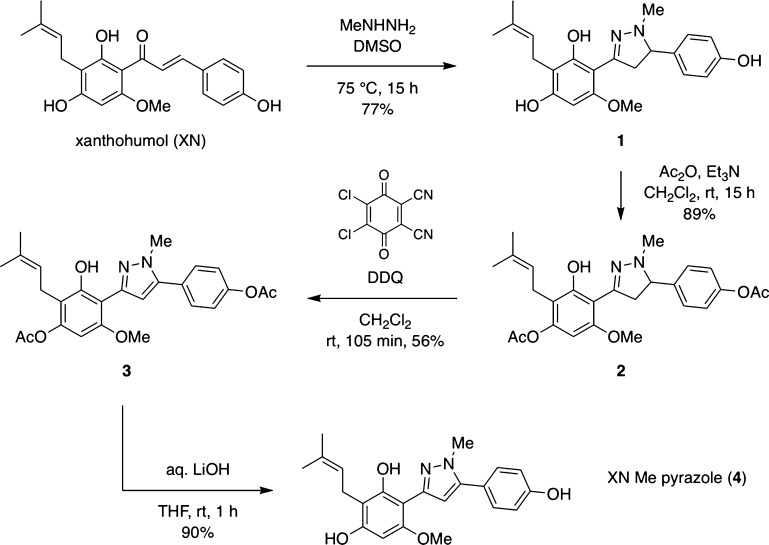 The synthesis of XP started with the treatment of XN with methylhydrazine in dimethyl sulfoxide (DMSO) at 70 °C to afford the corresponding pyrazoline 1 with 77% yield (Scheme 1). To obtain the oxidized derivative 4, we used DDQ as the oxidizing reagent after protection of the free phenolic moieties of pyrazoline 1, which are sensitive to oxidative conditions. Pyrazoline 1 was acetylated with acetic anhydride, in the presence of triethylamine, to obtain derivative 2. Interestingly, only two of the three free hydroxyl groups were acetylated. This was likely due to a strong hydrogen bond between the remaining hydroxyl group and the free nitrogen of the pyrazole derivative. Indeed, the presence of a far downfield signal in the 1H NMR (12.0–12.5 ppm) of XP and XP intermediates (Figures S1–S8) could suggest the formation of a highly conjugated enamine/orthoquinomethide tautomer (Figure S9). XN is also characterized by a strong hydrogen bond between one hydroxyl group and its carbonyl moiety, favoring the fully conjugated tautomer.22 Compound 2 was treated with DDQ in dichloromethane to afford derivative 3 with 56% yield. For the final deprotection, two strategic approaches were undertaken. Exposure of derivative 3 to potassium hydroxide, in methanol at 0 °C, resulted in product degradation. Therefore, the final compound 4 was obtained with 97% yield by hydrazinolysis by treating derivative 3 with hydrazine monohydrate. This method avoids strong basic reagents, which, in the presence of phenolic groups, could lead to the formation of reactive quinone derivatives, resulting in polymerization processes. However, hydrazine is known to be highly toxic. Hence, other conditions were tested, and exposure of compound 3 to lithium hydroxide afforded compound 4 with 90% yield.
