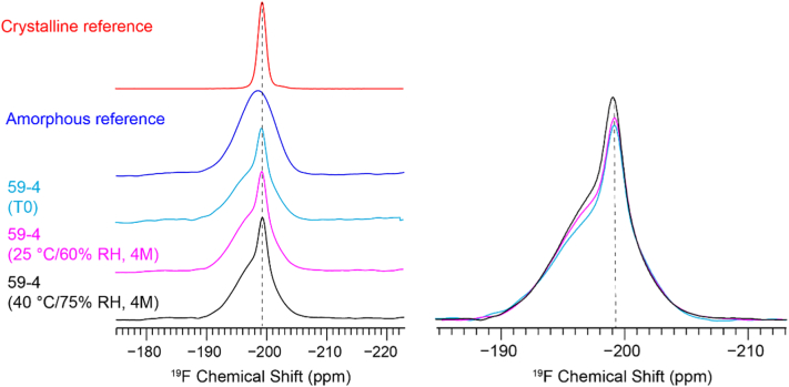 19F ssNMR quantification of crystallinity in LY3009120 ASDs. Left: an array of 19F CP-MAS spectra of crystalline and amorphous references, 59–4 ASDs at T0, 25 °C/60% RH (4-month) and at 40 °C and 75% RH (4-month). Right: Overlaid spectra to illustrate the various crystalline contents. A reference-based method was utilized for 19F quantification (Huang et al., 2018).
