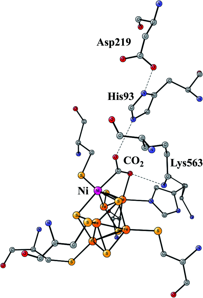 Ni,Fe-CODH uses a cofactor with four irons and one nickel as shown in Fig. 13. It can be described as an Fe4S4-cluster in which one iron has been pushed out by a nickel. The X-ray structure has been determined with a high resolution for an intermediate with a bound CO2.61 Apart from the metal cofactor there is a hydrogen-bonded chain with His93 and Asp219 of probable high significance. There is also a positive lysine (Lys563) that can form a strong hydrogen bond to the substrate. Recently, the mechanism was investigated with the methods described in this review.62 The experimentally suggested oxidation state for the structure in the figure is Ni(ii)Fe(iii)3Fe(ii). An important experimental result is that CO2 reduction is reversible.60 That fact can be used also for testing the accuracy of the results, as described below.