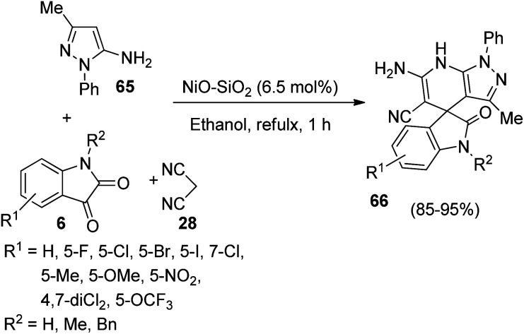 A strategy for the synthesis of spirooxindole-fused pyrazolo pyridine derivatives 66 utilizing silica supported NiO nanoparticles as catalyst was put forth by Yagnum et al. in which they also studied the anti-microbial activities of the novel compounds.55 The one-pot reaction between three components-dicyanomethane 28, isatin 6 and 3-methyl-1-phenyl-1H-pyrazole-5-amine 65 was advanced in ethanol, 6.5 mol% of NiO–SiO2 at reflux temperature (Scheme 26). Isatins with electron-withdrawing and electron-releasing groups were tolerated in the reaction. The yield was a little higher for 5-substituted and 7-substituted isatins relative to 4,7-disubstituted ones. There was no prominent role for steric and electronic factors. According to the suggested mechanism, the reaction follows a Knoevenagel condensation/Michael addition/cyclization/isomerization sequence. Anti-fungal and anti-bacterial properties were displayed by most of the spirooxindole derivatives so-obtained.