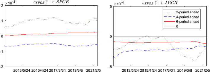 The unit root test results of Augmented Dickey-Fuller (ADF) (Fuller, 1979) and Phillips-Perron (PP) (Phillips & Perron, 1988) are presented in Table 2. The results show that the time series of SPGB, SPCE and MSCI are non-stationary, while they are stationary after the process of first-order logarithmic difference. Therefore, we employ the first-order logarithmic difference of the data to the TVP-VAR model.