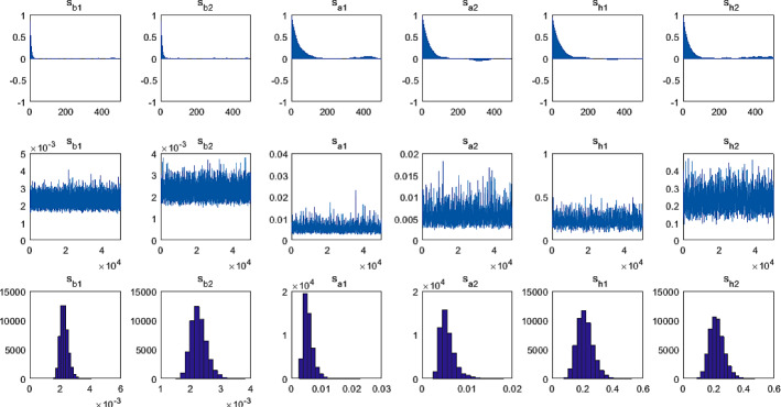 Figure 3 shows that the sample autocorrelations show a steady downward trend, and sample paths are stable, indicating that our sampling method efficiently produces the samples with low autocorrelation. The results show that the simulation process is effective and robust, and the simulation results converge to the posterior distribution.