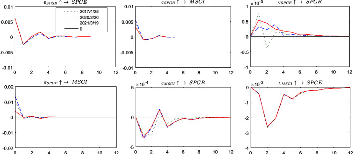 In this paper, the Brock–Decher–Scheikman (BDS) test was performed on the nexus between variables. The BDS test results showed in Table 3 demonstrate that SPGB, SPCE, and MSCI all showed a nonlinear relationship. The reasons can be explained as follows. There exists certain cycle in the operation of economy, which will affect investor sentiment and enterprises’ performance. Generally speaking, investors’ income increases in a prosperous or recovering period, leading to more positive sentiment among investors and more enthusiasm for high-risk products, which will cause market participants to invest funds in stocks. On the contrary, investors’ income decreases in a period of recession or depression, causing investors to feel pessimistic. At this time, investors are keen on low-risk products, and they are more likely to invest funds in lower-risk but lower-yield products, thus causing funds to gradually enter green bonds. As for enterprises, green bonds may have different impacts on corporate performance in different economic periods, the issuance of green bonds may help environmentally friendly enterprises resume production during the recession, resulting in better performance in stock market. More and more countries focus on the development of green economy, which leads to the improvement of green bond system. Thus, the performance of green bonds may show significant difference in different period, which will further cause the difference of the investment and consumption of clean energy supported by green bonds. Similarly, there also exists obviously difference of the relationship between clean energy and stock price in different stage. Therefore, we use the TVP-VAR model to solve the nonlinear relationship between green bonds, clean energy and stock price.