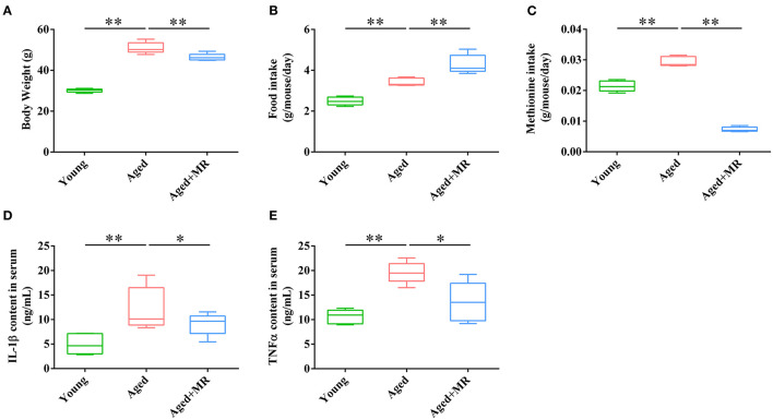 Effects of methionine restriction on the body weight, food intake, and serum cytokines concentrations of aged mice. (A) Body weight; (B) food intake; (C) methionine intake; (D) IL-1β content in serum; (E) TNF-α content in serum. The boxplot elements are defined as following: center line, median; box limits, upper and lower quartiles; whiskers, min to max (n = 5/group). Significant differences between mean values were determined using one-way ANOVA analysis of variance with Tukey's multiple comparison test; *p < 0.05, **p < 0.01.