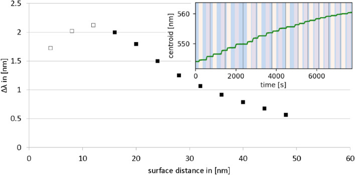 LSPR detection yielded the sensor response for attachment or binding events on the sensor surface. The well-established layer-by-layer deposition using PAH and PSS was utilized to demonstrate the sensing approach34,37–39: The deposition of each additional layer on a gold nanoparticle chip (80 nm spheres) in a microfluidic system resulted in a longer wavelength (red) shift of the resonance peak. This is visible as individual steps in the sensogram, which plots the LSPR response over time (Fig. 2 inset).