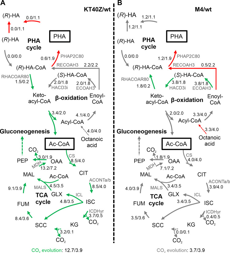 In contrast, the M4 model shows significant differences in terms of flux distribution compared to the wild-type model (Fig. 6B and Data Set S1). Overall, the model predicts an important metabolism deceleration in M4 that is likely driven by a lower uptake of octanoate (2.2 versus 3.8). Significant decreases in the flux through the β-oxidation pathway, PHA synthesis, TCA cycle, and gluconeogenesis were predicted (Fig. 6B). As expected by the high levels of depolymerase present in strain M4, all the PHA synthesized was further hydrolyzed and subsequently secreted to the medium. Interestingly, this observed metabolism deceleration had no influence on growth rate, and similar values were found in both strains. These results strongly suggest that, during this phase, the greater the PhaZ activity, the lower the carbon spilling in the form of CO2.