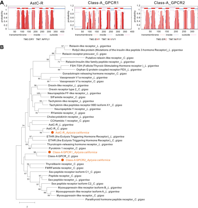 Bioinformatics of putative AstC receptors. (A) Prediction of 7TM of putative receptors: AstC-R, Class-A_GPCR1 and Class-A_GPCR2 using TMHMM. Conserved motifs in transmembrane domain 3 (TM3, D/ERY) and TM7 (NPXXY) are shown. The amino acids different from the motifs are shown in red. (B) A phylogenetic tree of three Aplysia proteins, AstC-R, Class-A_GPCR1, Class-A_GPCR2 (shown in orange) with L. gigantea and C. gigas Class A GPCR sequences from Jekely8 (see the Results and Supplementary Table 5) using MEGA X (See the bioinformatic section of the Methods for more details). Refer to the “Final name” worksheet in Supplementary Table 5 for the naming of the sequences. A Class B GPCR, Parathyroid hormone peptide receptor_C. gigas, was used as an outgroup. The tree suggests that AstC-R is an AstC receptor, whereas Class-A_GPCR1 and Class-A_GPCR2 are not. The tree is drawn to scale, with branch lengths measured in the number of substitutions per site. Numbers at the nodes are bootstrap values as percentage. Only bootstrap values greater than 50 are shown.