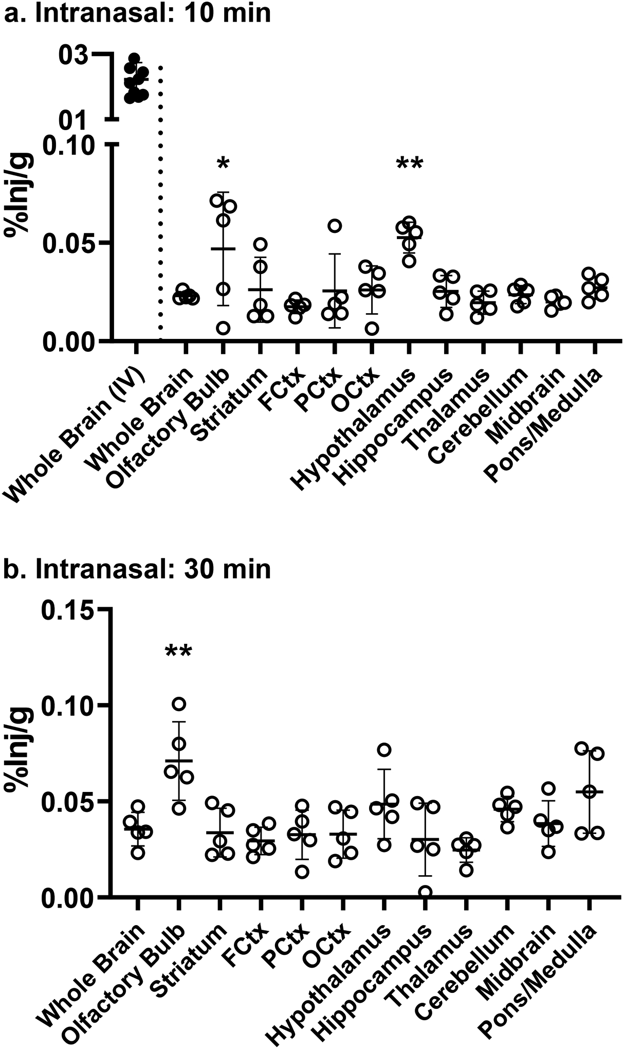 Brain uptake of I-S1 (RayBiotech) delivered intranasally (1 μL/naris), expressed as % administered dose taken up per g of each brain region (%Inj/g). a. Ten minutes after intranasal administration, I-S1 was detected in all dissected brain regions. One-way ANOVA showed a significant effect of brain region [F(11, 48) = 3.77, p = 0.0006], with significantly higher uptake in olfactory bulb (p = 0.031) and hypothalamus (p = 0.0041) compared to whole brain (Dunnett’s multiple comparisons test). Whole-brain uptake after intranasal administration was 0.023 ± 0.0008 %Inj/g; for visual comparison, the panel also shows the whole-brain %Inj/g 10 min after IV injection as calculated from the control values for the LPS experiment in Figure 6 (filled circles, 0.22 ± 0.016 %Inj/g); N=5 mice. b. Thirty minutes after intranasal administration, I-S1 was detected in all dissected brain regions. One-way ANOVA showed a significant effect of brain region (F(11,48) = 4.33, p = 0.0002), with significantly more uptake in the olfactory bulb compared to whole brain (p = 0.0023, Dunnett’s multiple comparisons test). A two-tailed t-test showed significant increases between 10 and 30 minutes for whole brain (p=0.0143, t=3.116, df=8), frontal cortex (p=0.0391, t=2.464, df=8), cerebellum (p=0.0003, t=6.226, df=8), midbrain (p= 0.0098, t=3.370, df=8) and pons (p=0.0232, t=2.801, df=8) but not the other regions. N=5 mice. * p<0.05, ** <0.01, *** <0.001; FCtx = frontal cortex, PCtx = parietal cortex, OCtx = occipital cortex.