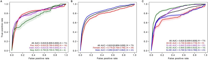 Accuracy changes across different populations. The model trained at PX + 0: PX + 2 showed different performance accuracy (ROC AUC) when we segregated participants by antibody test result (A), sex (B) and age group (C); [95% CI] (N). Each panel uses the participants (n = 73) who reported positive diagnostic tests for SARS CoV-2 and were included in algorithm training. Pos = positive, Indet = indeterminate, Neg = negative antibody test. The algorithm performed as expected on individuals with positive antibody tests (red), who were very similar to individuals with indeterminate antibody tests (purple). The algorithm was less accurate for individuals with negative antibody tests (green), consistent with the algorithm showing COVID-19 specificity. The ROC AUC for women was lower than the ROC AUC for men. Age groups showed different levels of overall accuracy that were not merely proportional to N.