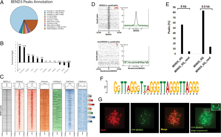 BEND3 associates with GQ-rich sequences at promoters. (A) Percentage of BEND3 peaks at promoters and at nonpromoter regions. (B) Enrichment score of BEND3 peaks in multiple genome sites. Annotation enrichment analysis performed by the Homer tool compares the annotation distribution of the input peaks compared to a background set of peaks. The log2 ratios in the figures show the enrichment of different genomic locations between the input peak annotation and background peak set. Positive enrichment values mean that the input peak set was more enriched, while negative enrichment values mean that the background peak set was more enriched. (C) Heatmap showing the colocalization between BEND3 peaks, with different histone marks in NTERA2 cells. (D) Heatmap (Left) and graphs (Right) showing the colocalization between BEND3 peaks (Top) or randomized peaks (Bottom) with quadruplex regions in NTERA2 cells. The randomized genomic file was generated by a script to randomize genomic regions (41). (E) Graph depicting the percentage of colocalization between BEND3 peaks and quadruplex regions. A 0-kb gap and a 0.5-kb gap (details in Materials and Methods) were used for the analysis. (F) Consensus sequence for BEND3 binding identified using a subset of BEND3-bound regions. (G) Localization of YFP-BEND3 at rDNA and telomeres.