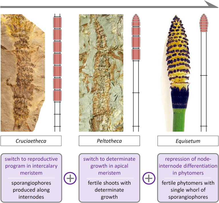 The realization that a reproductive program can be activated in the intercalary meristem of individual equisetacean internodes, leading to development of sporangiophores along them, opened up a new avenue for interpreting the reproductive structures of extinct (Cruciaetheca, Peltotheca) and living (Equisetum) equisetaceans as illustrating a cumulative sequence of deployment (gray arrow at top) of independent regulatory modules for three developmental processes (in purple, at bottom) responsible for the different features (in black, at bottom) that characterize specific reproductive morphologies; cross bars separate phytomers in the shoot diagrams and phytomers bearing sporangiophores are red; modified from [47]