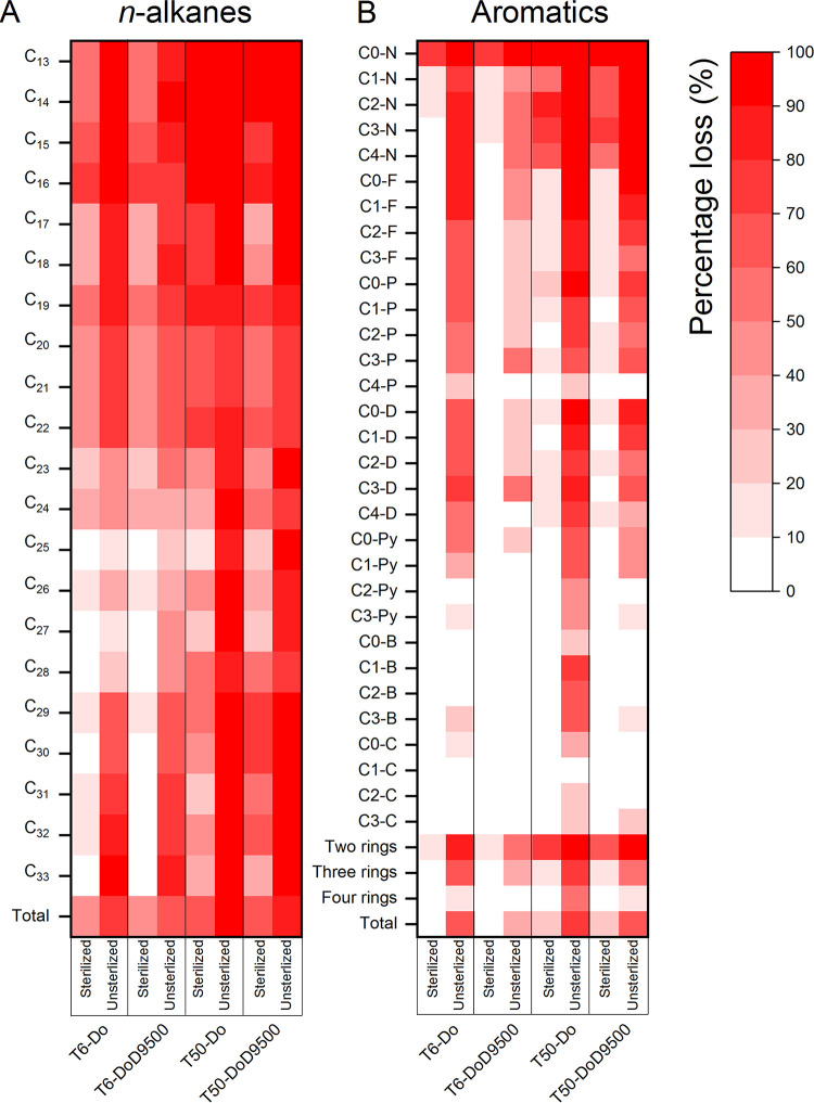 Chemical analysis showing percentage loss of n-alkanes (A) and aromatics (B) after 6 days and 50 days incubation of both treatments in abiotic and biotic microcosms. C13-C33, n-alkanes with corresponding carbon atoms; C0-N, C1-N, C2-N, C3-N, and C4-N, naphthalene and its alkylated homologs; C0-F, C1-F, C2-F, and C3-F, fluorene and its alkylated homologs; C0-P, C1-P, C2-P, C3-P, and C4-P, phenanthrene and its alkylated homologs; C0-D, C1-D, C2-D, C3-D, and C4-D, dibenzothiophene and its alkylated homologs; C0-Py, C1-Py, C2-Py, and C3-Py, pyrene and its alkylated homologs; C0-B, C1-B, C2-B, and C3-B, benzonaphthothiophene and its alkylated homologs; C0-C, C1-C, C2-C, and C3-C, chrysene and its alkylated homologs. Two rings, naphthalene and its alkylated homologs; three rings, fluorene, phenanthrene, and dibenzothiophene, and their alkylated homologs; four rings, pyrene, benzonaphthothiophene, chrysene, and their alkylated homologs. Mean values between three replicates are plotted.