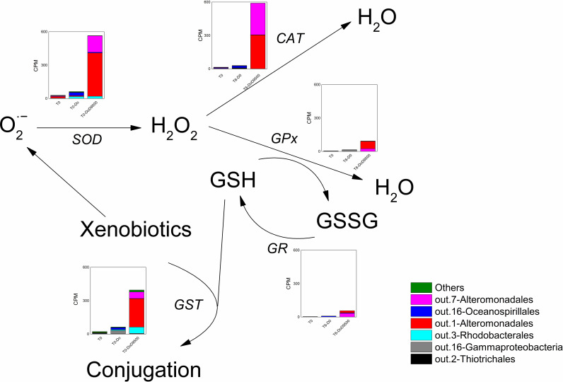 Microbial antioxidation can be utilized for evaluating the microbial responses to ROS. The mechanisms were recently reported in an anaerobic system based on the recovered MAGs (41). However, there is little information on the microbial antioxidation response toward naturally and chemically dispersed dilbit in a microbial community. We thus employed a metatranscriptomic-based MAGs approach to elucidate microbial antioxidation potential in response to the dilbit and dispersant application. We focused on antioxidant enzymes consisting of superoxide dismutase (SOD), catalase (CAT), glutathione peroxidase (GPx), glutathione reductase (GR), and glutathione S-transferases (GST) that can directly catalyze the conjugation of xenobiotics through glutathione (GSH) for detoxification (40, 42). Increased concentrations of xenobiotics can induce high concentrations of superoxide, which will be degraded by SOD to generate hydrogen peroxide (H2O2). There are two mechanisms for the removal of H2O2. The first one is directly through CAT, and the second one is via the GSH redox reaction. We found that the dilbit-only communities did not increase the transcripts of these genes compared to the initial seawater, while dispersant addition particularly enriched the transcripts of the GST, SOD, and CAT genes (Fig. 6). Transcripts of these genes were primarily increased from the two Alteromonas species, indicating that Alteromonas species may directly conjugate xenobiotics and quench the induced ROS mainly via the first mechanism to address the short-term exposure to chemically dispersed dilbit.