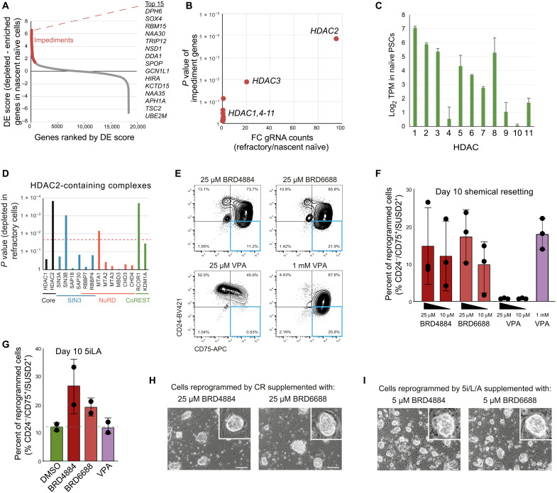 (A) Ranked DE plot by comparing nascent naïve with refractory populations. Impediment genes are highlighted. The top 15 ranked impediment genes are shown. (B) Chart shows the FC in gRNA counts and associated P values for all HDAC genes. (C) Chart shows the expression levels of each HDAC gene in naïve PSCs. Mean with SD, n = 3 biological replicates. Data are from (32). TPM, Transcripts Per Million. (D) Chart shows the P values of HDAC2-containing complex members as a measure of their depletion in the refractory cell population following the CRISPR-Cas9 screen. The red line indicates P = 0.02 as a significance cutoff. (E) Flow cytometry contour plots of WT PSCs at day 10 of naïve PSC reprogramming (CR conditions). HDAC2 inhibitors BRD4884 and BRD6688 and pan-HDAC inhibitor VPA were added at 25 μM. VPA added at 1 mM is also shown, which is the concentration used in the CR protocol and serves as a positive control. Successfully reprogrammed naïve cells appear in the bottom right quadrant. Data are representative of three independent experiments. (F) Chart shows the summary results from (E). Data show mean with SD for three independent experiments. Note that there was no significant difference in the reprogramming efficiency between the HDAC2 inhibitor–treated cells and the cells treated with VPA at 1 mM (two-tailed t test). (G) Chart shows the percentage of nascent naïve cells as measured by flow cytometry after 10 days of reprogramming under 5i/L/A conditions. HDAC2 inhibitors BRD4884 and BRD6688 and pan-HDAC inhibitor VPA were supplemented to the media at 5 μM for the first 3 days. Data show mean with SD for two independent experiments. DMSO, dimethyl sulfoxide. (H and I) Phase-contrast images of naïve PSCs following reprogramming in (H) CR medium or (I) 5i/L/A medium, supplemented with HDAC2 inhibitors BRD4884 or BRD6688. Scale bars, 100 μm.