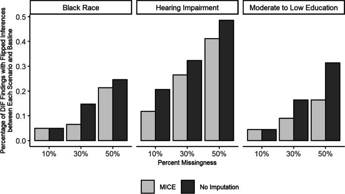 In many cases, the DIF estimation error due to missing data among those with low cognition led to changes in inferences regarding the significance of DIF estimates at the α = 0.05 level. However, implementing MICE resulted in a reduction of the proportion of inferences that were flipped compared to reference DIF estimates (Fig. 6). As single imputation does not produce valid standard errors, hot deck single imputation had minimal effects. Overall, across all of the cognitive test items and DIF grouping variables considered, the proportion of DIF estimates with flipped inferences due to 10%, 30%, and 50% missing data related to cognitive test performance was 10%, 21%, and 35% with no imputation, 10%, 18%, and 33% with hot deck single imputation, and 7%, 14%, and 27% with MICE.