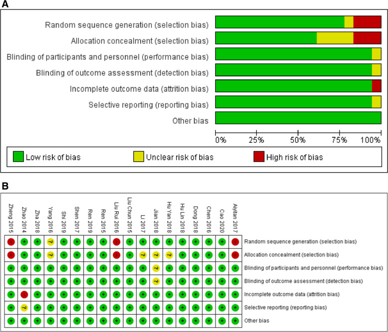 The Cochrane Collaboration’s tool was used to evaluate the quality of the individual studies based on the randomization, allocation hiding, blinding, publication bias, etc. Among 18 studies, 14 of them were described as randomized trials (5 of which were random number table method), 1 study was grouped according to the patient’s wishes, 2 studies were grouped according to the patient’s original treatment, and the last one article has not mentioned the method of grouping. For allocation concealment, 4 studies were not mentioned, and 3 studies may have higher allocation hidden risk. In addition, one trial was a single-blind experiment, and the others were not indicated the method of blinding. Unfavorably, one article had incomplete primary outcome indicators and selective-publication possibility. Notably, no other bias factor was found in all articles. The specific quality evaluation chart was shown in Fig. 2A-B.