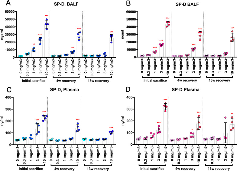 In all CWAAP-exposed rats, neither mortality nor respiratory clinical signs were observed throughout the study (Fig. 1a, b), and there was no change in final body weight (Fig. 1c, d). Differential white blood cell analysis showed an increase in the percentage of neutrophils and a corresponding significant decrease in the percentage of lymphocytes in the blood immediately after the 13 week exposure period in a CWAAP-A concentration dependent manner (Additional file 11: Extended file 1). In the 10 mg/m3 group, these changes were still significant after the 13-week recovery period, while in the 3 mg/m3 exposure groups these changes were no longer significant and in the 1 mg/m3 and 0.3 mg/m3 exposure groups these changes were completely resolved. Exposure to CWAAP-A significantly decreased total cholesterol and phospholipid (PL) in the plasma immediately after the 13 week exposure period in a CWAAP-A concentration dependent manner, however, these changes were mostly resolved after the 13 week recovery period (Additional file 12:Extended file 2). Other changes in the blood/plasma of the CWAAP-A exposed rats did not have a correlation with the exposure concentration or were very modest, suggesting low toxicological significance.