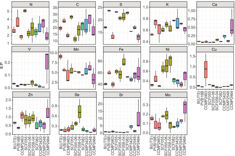 Elemental content plotted as elemental ratios normalised to phosphorus (E:P), of the ten Symbiodiniaceae isolates at 27.4°C. Data is mol:mol for macronutrients (C, N, S, K and Ca) and mmol:mol for micronutrients (V, Mn, Fe, Ni, Cu, Zn, Se, S, Mo). Lower and upper hinges of each boxplot correspond to the first and third quartiles, and 50% to the median. The upper and lower whiskers of each boxplot extend from the hinge to the largest and smallest value up to 1.5 × the inter-quartile range, respectively