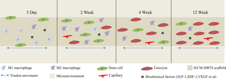 Fig. 9. Schematic illustration of the tendon regeneration process of the tECM-DBTS scaffold in vivo.