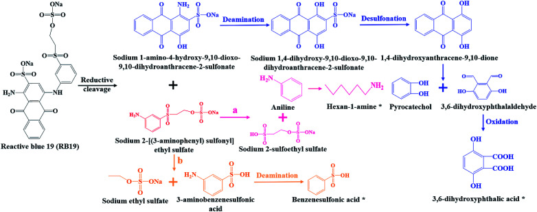 Fig. 5. Derivation of molecular transformation mechanism of RB19 by bacterial flora DDMY2 under the activation of tea residue. (a) and (b) were two possible metabolic pathways, the symbol (*) represented the detected products.