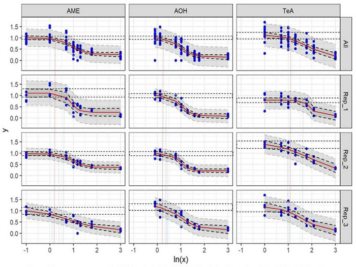 Dose-response curves of all (All) and of the individual biological replicates (Rep_1, Rep_2, and Rep_3) from the cytotoxicity assays of alternariol (AOH), alternariol monomethyl-ether (AME), and tenuazonic acid (TeA) on HepG2 cells. The x-axis shows the ln-values of the different mycotoxin concentrations and the y-axis the percentage of viable cells (PI–) after mycotoxin exposure in relation to the viable cells of the solvent control (DMSO). A gradient or slope non-linear curve fitting was applied. The prediction and confidence intervals are indicated by the dark and light gray zone, respectively. Lowest-observed-effect level (LOEL) values are indicated as blue (single replicates) and red (all replicates) dotted lines, respectively. All biological replicates consist of at least three technical replicates.
