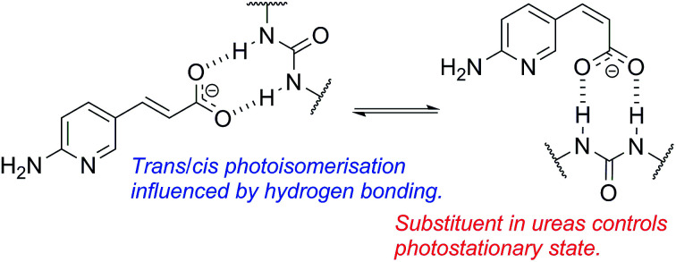 The association of aminopyridine-based acrylic acid and its salt was studied by NMR titration experiments. The AA (acceptor, acceptor) hydrogen-bonding pattern present in the salt forms a complex readily with a DD (donor, donor) hydrogen-bonding pattern of the substituted ureas even in polar and competitive environment. The double carbon–carbon bond in the acrylic acid derivative is subjected to photoisomerization. This is dependent on the association with substituted urea derivatives. The substituent in ureas influences the trans/cis isomerization kinetics and position of the photostationary state. Two mechanisms that influence the photoisomerization were proposed. To the best of our knowledge, the trans/cis photoisomerization influenced by the substituent in such a hydrogen-bonding pattern has not observed previously. It was shown that interaction with urea derivatives causes lowering of the trans-to-cis photoreaction rates.