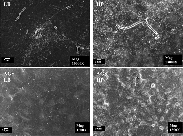 Microorganism and co-culture micrograph obtained by scanning electron microscopy. LB, L. fermentum; HP, H. pylori; AGS and LB or HP indicates co-culture. Different magnifications highlight bacteria or cells morphology.