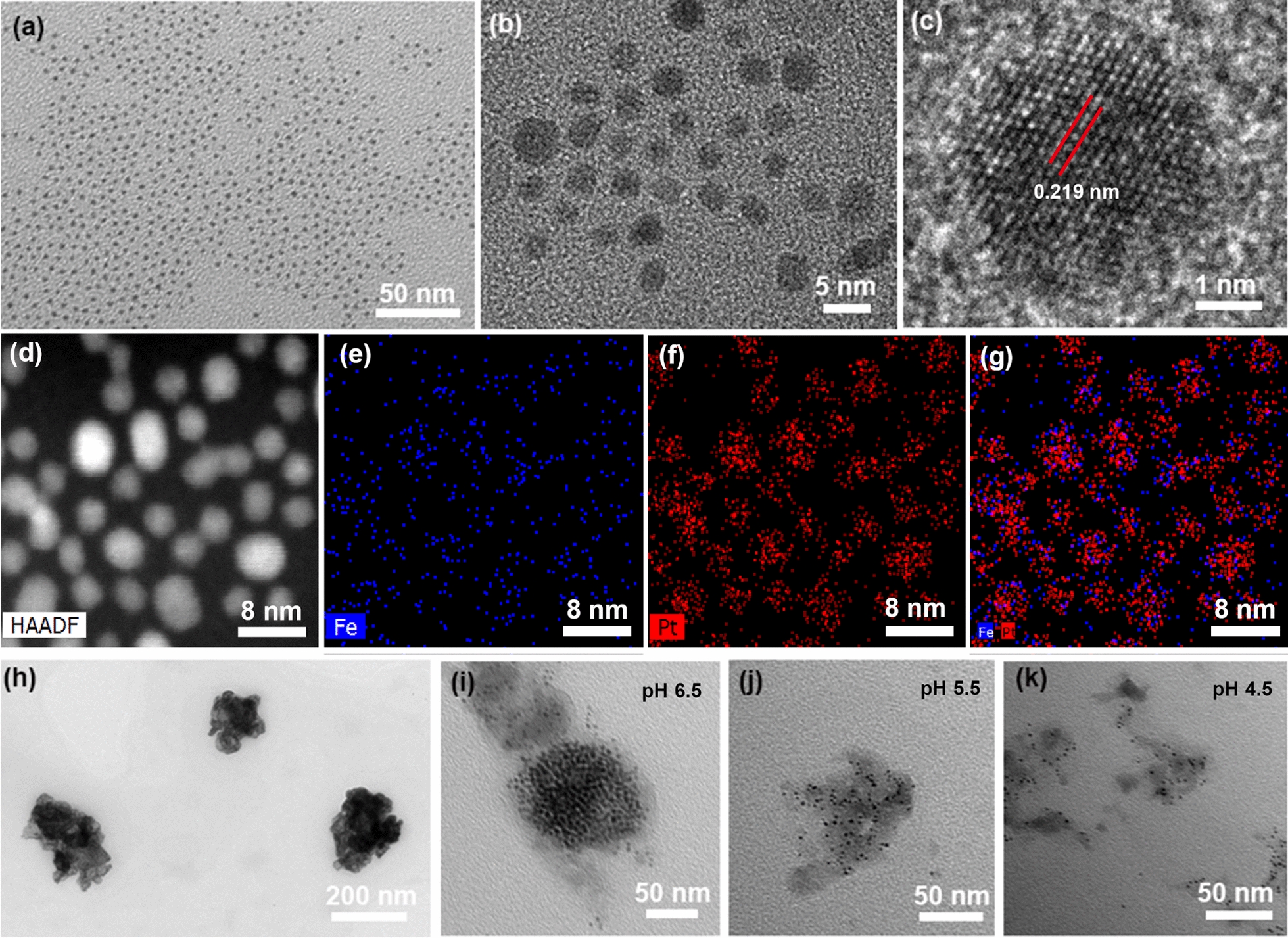 TEM observation of FePt nanoparticles: a low-magnification image, b high-magnification image, c high-resolution image. Elemental mapping images of FePt nanoparticles: d bright field image, e Fe element, f Pt element, and g merged images. h TEM images of LFePt-GOx. i–k TEM images of LFePt-GOx after treatment with different acidic solutions (pH 6.5, 5.5, and 4.5), respectively
