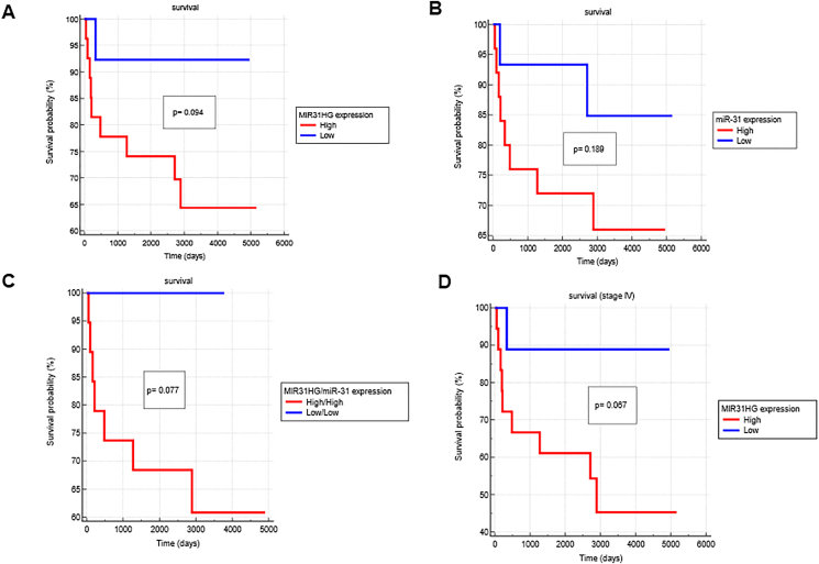 Kaplan–Meier survival analysis. (A–C) All tumors. (A) MIR31HG, (B) miR-31, (C) both MIR31HG and miR-31. (D) Stage IV tumors/MIR31HG. Cut off values of −ΔΔCt achieved from preliminary tests is used to divide tumors with high or low expression.