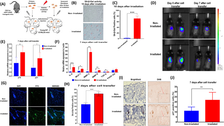 Increasing levels of skin senescence through subcutaneous irradiated fibroblast transfer. A Study design: primary mouse-ear fibroblasts isolated from CAG-Luc-eGFP L2G85 transgenic mice. 10-Gy irradiated (or) non-irradiated fibroblast cells were transplanted subcutaneously into wild-type C57BL/6 J mice (8 weeks old). B, C SA-β-gal cells in non-irradiated and irradiated fibroblast cultures 10 days after irradiation. D Xenogen IVIS Imaging System of transplanted cells in young mice on day 0 and after 7 days after transplantation. E, F The relative expression of senescence and SASP markers in the skin 7 days after cell transfer. G, H SA-β-gal staining and quantification of positive cells 7 days after cell transfer, nuclei (DAPI), 10 × magnification. I, J p21 staining and quantification of positive cells 7 days after cell transfer, 10 × magnification. t-test; ***p < 0.001, **p < 0.01, *p < 0.05