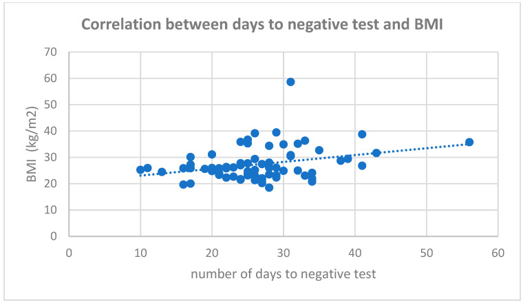 Factors associated with longer hospitalization, and therefore longer period of positive test, were age, body mass index, male gender, and chronic condition such as cardiac, renal disease, liver, and neurological disease (see Table 2). There was a mild to moderate correlation between age and body mass index (see Figure 1 and Figure 2).