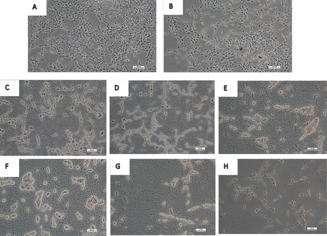Microscopic examination of neuronal cells after treatment with ANT and BEN (25, 50 and 125 µM) for 48 h. Cells were seeded in 24 well plates and were treated with ANT and BEN. After 48 h, cells were observed in a microscope in a phase-contrast mode. Magnification – × 100 µm. a control cells; b vehicle; c cells treated with 25 µM ANT; d cells treated with 25 µM BEN; e cells treated with 50 µM ANT; f cells treated with 50 µM BEN; g cells treated with 125 µM ANT; h: cells treated with 125 µM BEN