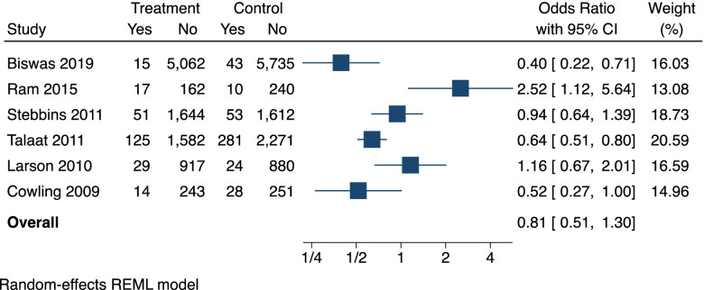Figure 2 displays the effect estimates (crude odds ratios) of the six interventions studies. Four of the studies [19, 22–24] had odd ratios of less than one, indicative of a protective effect of the HH intervention against influenza; however, this effect was only statistically significant in the two largest studies by Talaat et al. [23] (OR: 0.64; 95% CI: 0.51, 0.80) and Biswas et al. [24] (OR: 0.40; 95% CI: 0.22, 0.71). The intervention in Ram et al. [21] was associated with a significant increase in influenza (OR: 2.52; 95% CI: 1.12, 5.64) and Larson et al. [20], was associated with a non-significant increase in influenza (OR: 1.16; 95% CI: 0.67, 2.01).