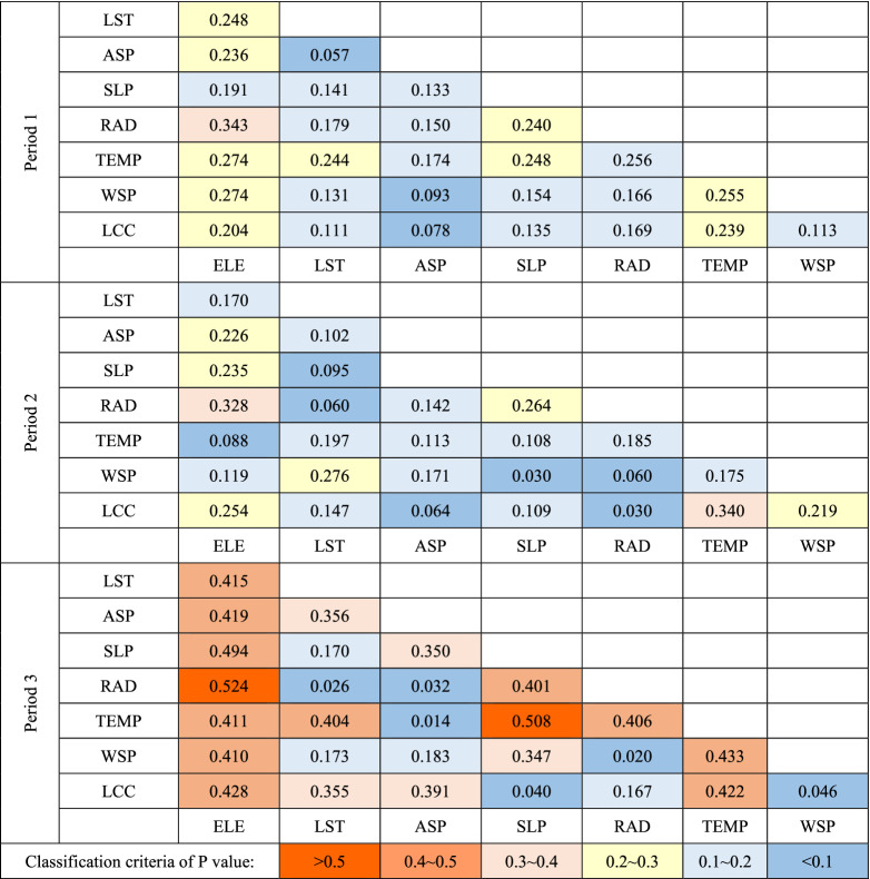 The parameter was proposed here to quantify the interaction between two factors. Its value is the difference between the Q values of the stacked factors and the sum of the Q value of each factor. The regional maximum P values in different periods were statistically analyzed to explore the temporal and spatial differentiation characteristics of the environmental factor interactions. Table 5 shows three pairs of interactive factors with the most significant interaction in different subregions for the three stages of melting with their corresponding P values.